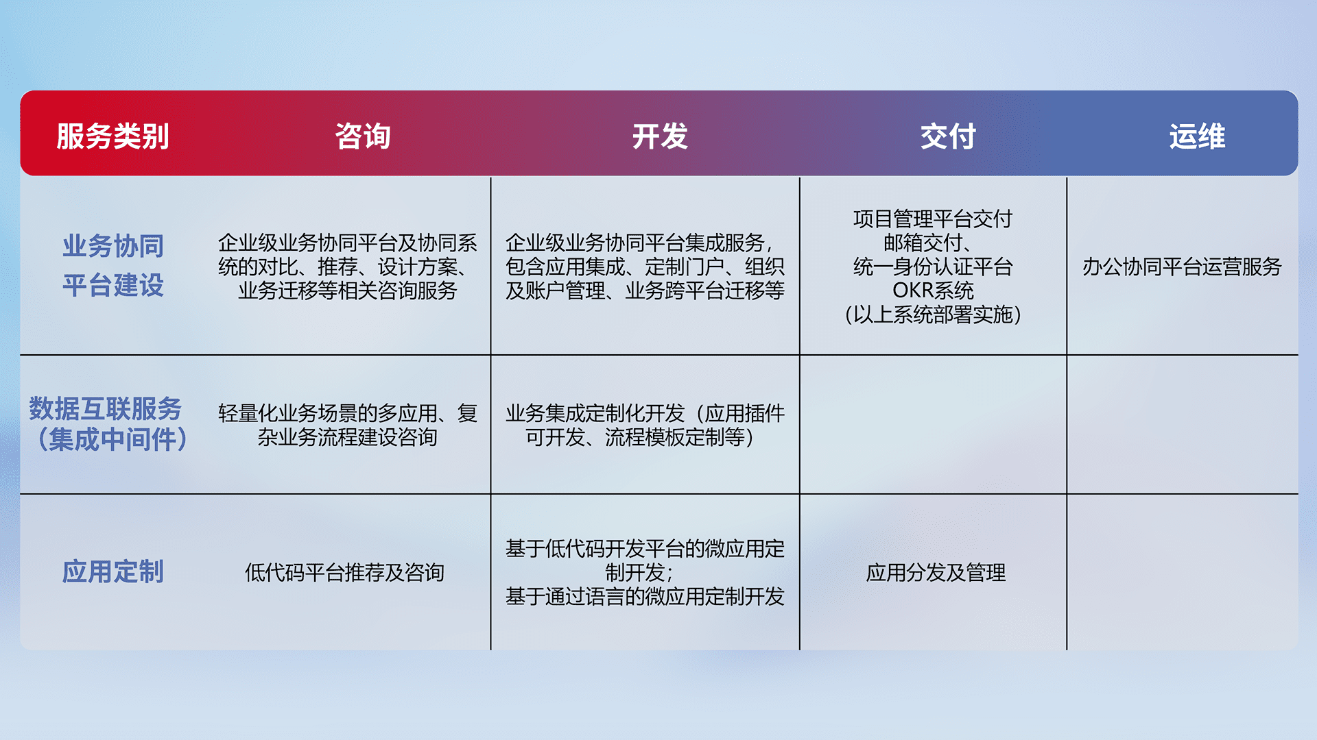 针对钉钉、、、企微、、IDaas等平台级产品提供产品的规划、、、方案、、交付、、定制化开发等服务,,,实现如统一协同办公、、、、智能客户服务、、、混合会议管理、、、、智能数据查询、、等业务场景,,,,实现数字化转型。。
